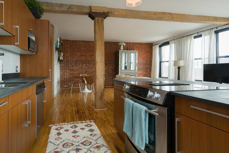 This loft space is perfect for those with a taste for a modern, industrial chic look. The unit includes exposed brick walls, reclaimed hickory floors, stainless steel appliances, cool black countertops and more — not to mention the abundant windows! The unit is a one bedroom with more than 1,000 square feet to spread out, so you'll have plenty of space. Additionally, you'll be able to enjoy views of the surrounding cityscape, lots of natural light, out-of-unit storage space, elevator access, and an in-unit laundry.