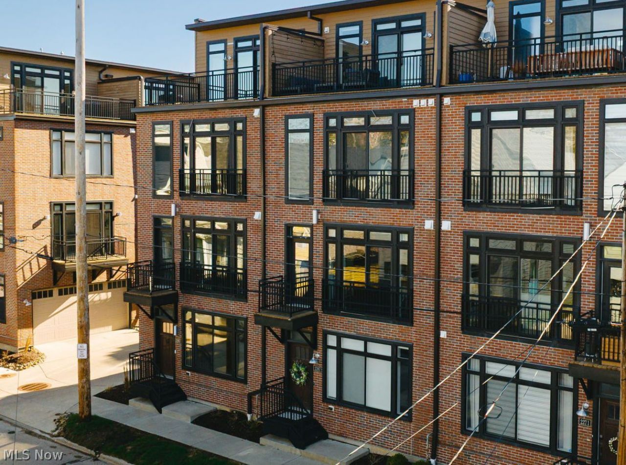 Discover sophisticated, modern city living in the heart of Duck Island, one of Cleveland's most desirable and vibrant urban neighborhoods. This newer construction tax-abated townhome offers exceptional value along with high-end design, thoughtful upgrades, and an unbeatable location equally convenient to Ohio City, Tremont, and Downtown. Enter through the attached two-car garage into a versatile first-floor flex space?perfect for a private office, home gym, studio, lounge, guest room... complete with storage and a Murphy bed. The main living level impresses with high ceilings, beautiful natural-tone wood flooring, and walls of windows that flood the space with natural light and welcoming views of the neighborhood. At the heart of the home is a chef's kitchen featuring quartz countertops, stainless steel appliances, custom cabinetry, a striking tile backsplash, and a large island ideal for both everyday living and entertaining. The open layout seamlessly connects the kitchen, dining, and living areas, anchored by a stylish modern fireplace and complemented by charming balconies and a convenient half bath. Upstairs, the third level offers two spacious bedrooms, each with its own private luxury bath. The owner's suite serves as a true retreat with spa-like finishes including double vanities, elegant stone counters, a walk-in glass-enclosed ceramic tile shower, and generous closet space. A large laundry closet adds everyday convenience on this level. The top floor elevates the living experience with a stunning indoor-outdoor entertaining space, featuring a lounge area with wet bar that opens to two expansive rooftop terraces. Enjoy a unique 'above the treetops perspective year-round. Perfect for relaxing or hosting guests. This home offers the perfect blend of luxury, convenience, and lifestyle. This is the place to live your best city life!